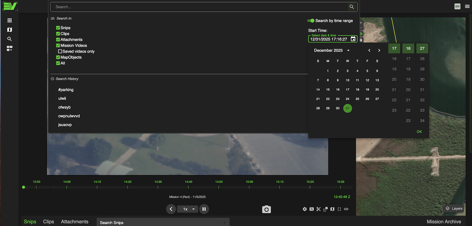 Edge View allows users to search within a mission for mission-specific products, such as snips, clips, attachments, and more. But, Edge View also provides a global search capability that performs information retrieval across all missions and products.